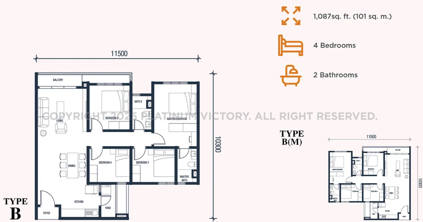 Discover the spacious and thoughtfully designed Type B layout at PSV2 Residences. Spanning 1087 sqft, this unit offers enhanced living areas, perfect for growing families or those seeking extra comfort.